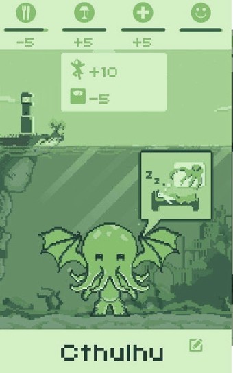 3、游戏的画面特别怀旧模拟了上世纪年代掌机的单色显示屏的色调。游戏一开始你养的宠物克苏鲁宝宝就出现在太平洋底的拉莱耶城旁等着你的陪伴。